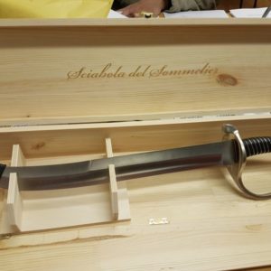 Sommelier’s sabre for opening sparkling wines in a wooden box.
